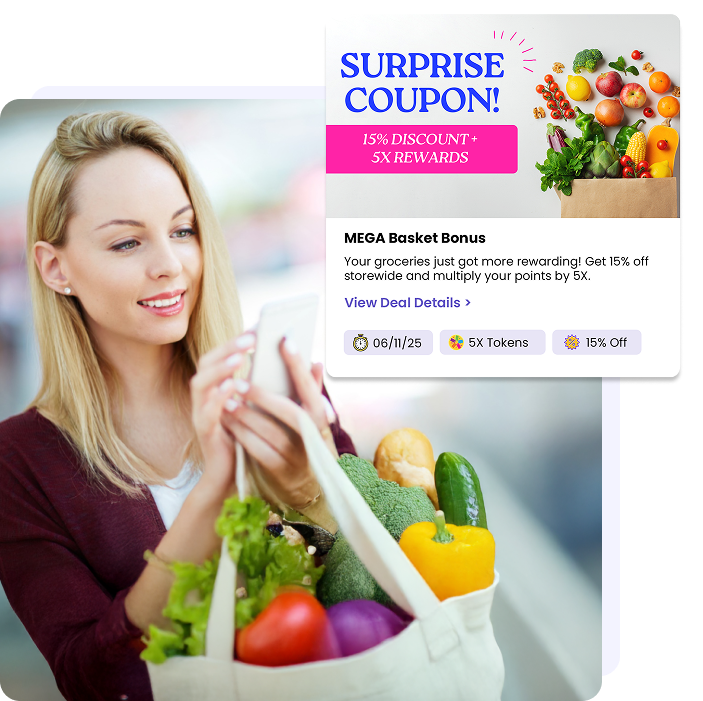 Give shoppers instant gratification! They earn immediate rewards at checkout based on their purchases—like bonus points for buying fresh produce or discounts on their next grocery haul.